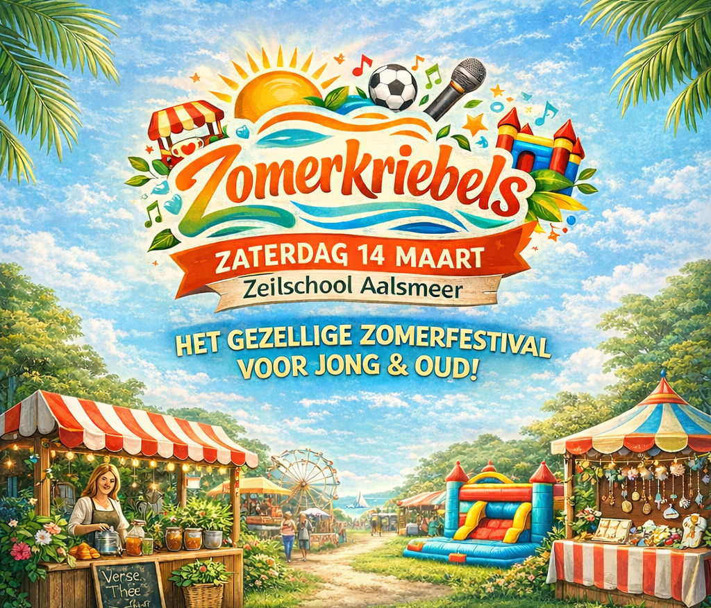 Op 14 maart 2026 nodigen we je uit bij Zeilschool Aalsmeer voor Zomerkriebels: een klein en gezellig festival vol zomerse muziek, lokale lekkernijen, verfrissende drankjes en leuke activiteiten voor jong en oud. Omdat de echte zomer nog zo lang op zich laat wachten!